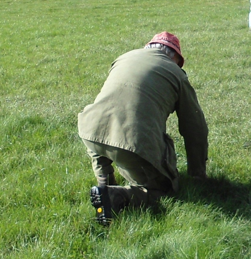While I was in France, I was invited to visit a farm in the Alpes Maritimes, at an elevation of 1000m. Here I was shown M. oreades growing in classic fairy rings in an open paddock. The rings could be seen quite clearly by their dark green colour in comparison to the surrounding grass. The image below shows my host kneeling down to harvest some mushrooms from one of the rings.