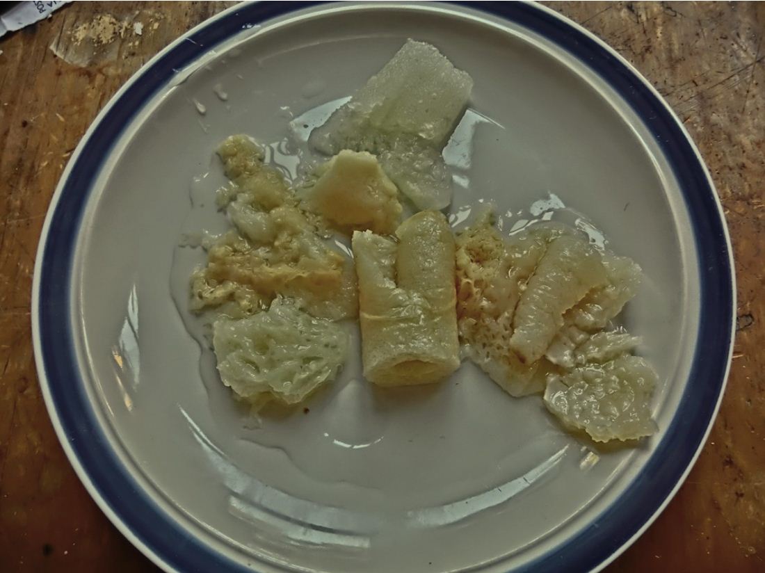 I cooked up some of the pieces, which contained quite a lot of water, in a frying pan with a little olive oil and then added them to an omelette. I found that the taste was best in the pieces that had been slightly browned. This may be due to the considerable amount of glucose contained in the structure of the cell walls.